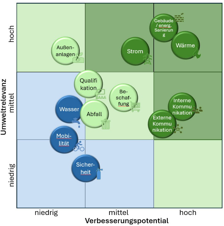 Die Umweltaspekte mit höchster Priorität finden sich in den drei dunkelgrünen Feldern, die mit mittlerer Priorität in den drei hellgrünen. Die Umweltaspekte mit niedrigerer Priorität in den drei blauen Feldern.